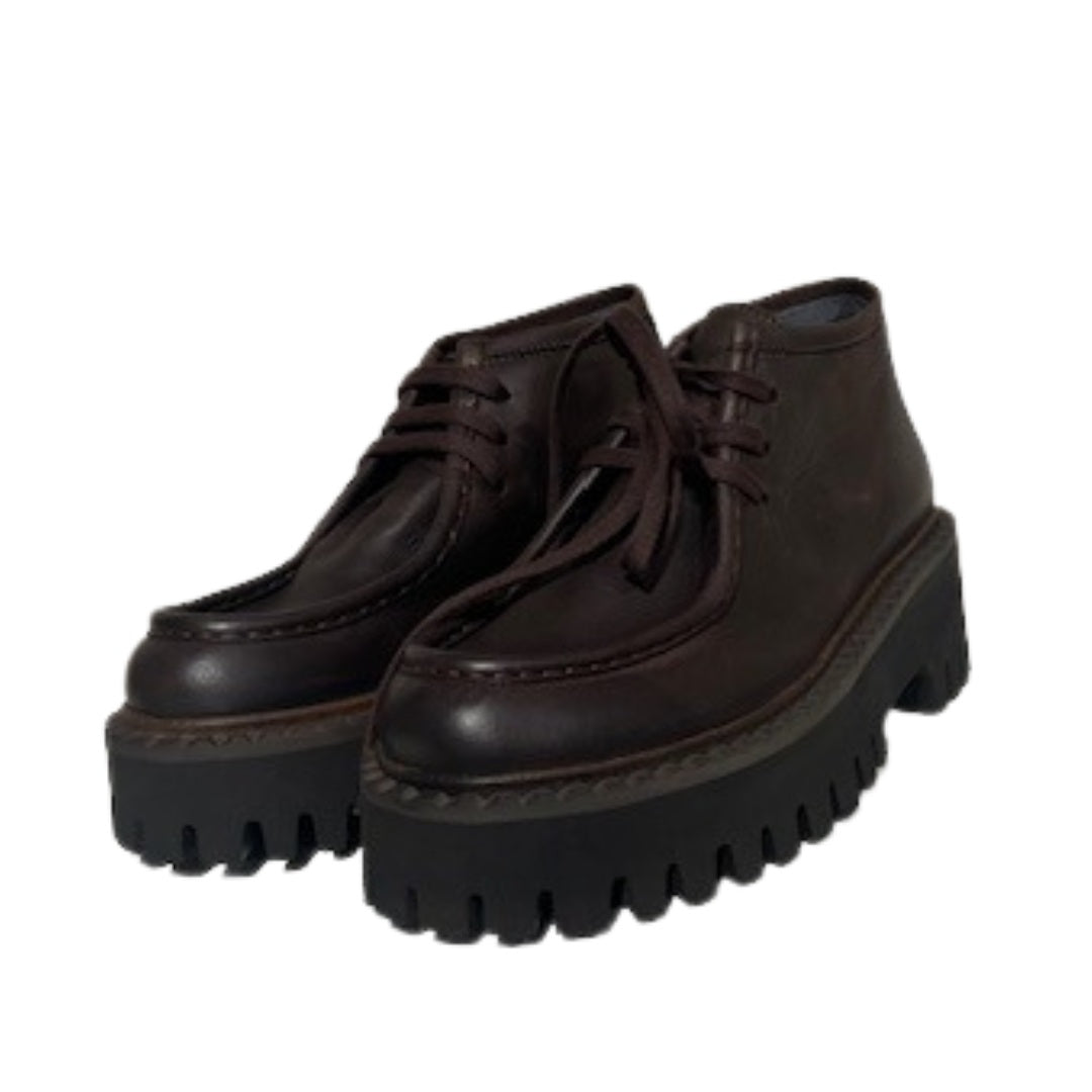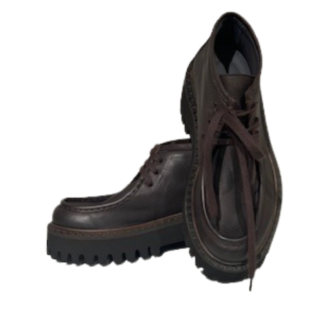 Lav støvle i mørkebrunt glat kalveskind, som er foret med svineskind for god åndbarhed og komfort. Støvlen er med matchende snøre. Den rå og lidt chunky sorte sål giver skoen et smart udtryk samt en meget behagelig følelse at gå på. Style eksempelvis med Sort Aarhus tøj i matchende farver eller en af de lækre konfektions-styles fra samme brand. Normal i størrelsen.