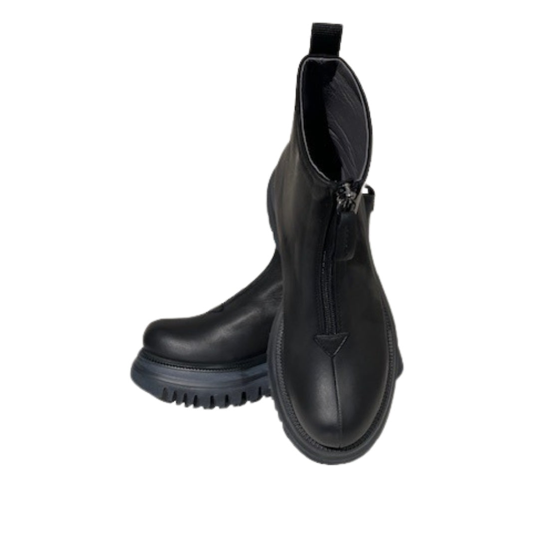 Støvle i glat kalveskind foret med svineskind, som kommer med en front-lynlås for at give et råt udtryk. Samtidig er støvlen nem at tage af og på. Her får du en komfortabel og rå sål lavet af syntetisk gummi.Støvlen er lavet i kalveskind foret med svineskind. Sålen er lavet i blandingsmaterialer af syntetisk gummi.